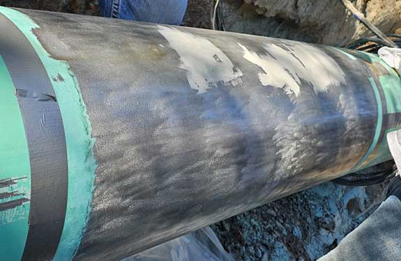 In October 2025, a section of 16″ high pressure natural gas pipeline exhibiting external corrosion defects was identified for a composite repair. The affected area measured approximately 24 inches in length with <50% wall loss. Following assessment and surface preparation, the repair zone was defined as a 36″ linear section to ensure full coverage beyond the corroded area and proper load transfer of the composite system. For this project, the Denso Protal™ 2800CF Composite System was selected due to its proven performance in corrosion rehabilitation and mechanical reinforcement applications. The system was applied using the “Spiral Wrap” method to ensure consistent overlap, uniform tension, and optimized adhesion throughout the carbon composite zone. The proper number of layers were installed to meet the design requirements per ASME PCC-2 Art. 401. Prior to application, environmental conditions were verified to ensure compliance with the Denso’s specifications. The dew point was monitored throughout the installation and recorded between 52°F and 44°F, confirming suitable ambient conditions for proper curing and adhesion.